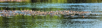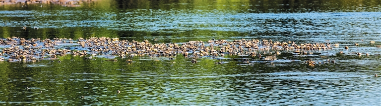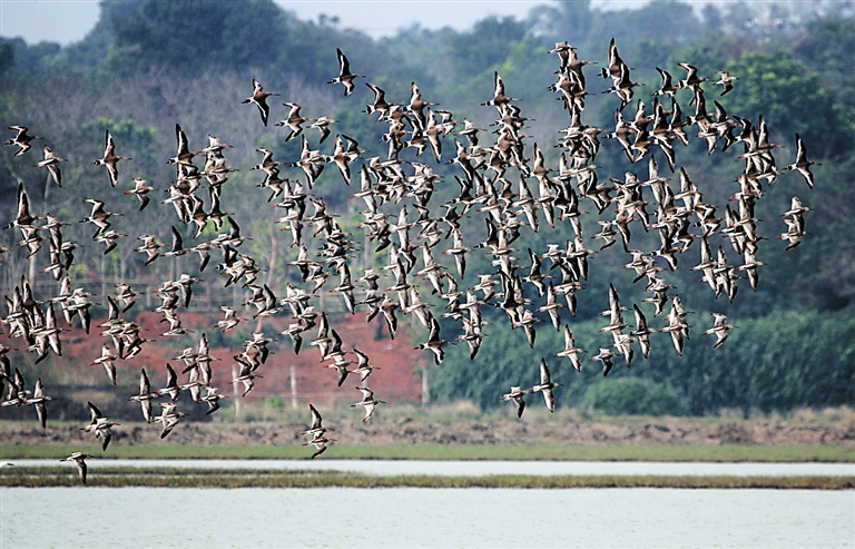 栈道十里,朱漆栏杆,九弯十八曲,步步迴转。依红树行迹前行,迤逶延伸,林间白鹭偶惊起,展翅盘旋于绿荫上,闻有人声,急飞数米,脚尖踮于栏杆上,唳唳而叫,仿佛在诉说。