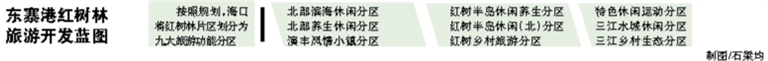 海口市旅游委相关负责人告诉记者,海口已经为东寨港红树林未来的旅游开发画出了“蓝图”。按照海口市公布的《海口市东寨港旅游区总体规划(2012-2013)》,红树林片区的旅游的主题形象是“海上森林,优雅海岸”,总体发展定位是以红树林湿地保护和生态修复为核心,适当开发科研教育、特色旅游和休闲养生等功能的生态旅游示范区。按照规划,结合旅游资源分布、生态管制分区和旅游项目整体开发需要,海口将红树林片区划分为九大旅游功能分区,分别是北部滨海休闲分区、北部养生休闲分区、演丰风情小镇分区、红树半岛休闲养生分区、红树半岛休闲(北)分区、红树乡村旅游分区、特色休闲运动分区、三江水城休闲分区、三江乡村生态分区。现在红树林湿地森林小镇、红树林乡村旅游区、演丰风情小镇3个旅游项目已经落地。