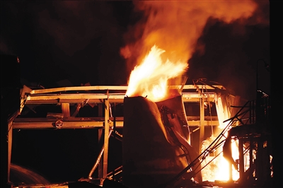 8月23日,山东润兴化工厂发生爆炸现场。 8月22日20时56分位于山东省淄博市桓台县果里镇东付村的润兴化工科技有限公司发生起火爆炸事故,造成1人死亡,9人受伤。记者从桓台县委宣传部获悉,事故是由一分离器着火并发生爆炸引起的。新华社记者 郭绪雷 摄