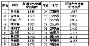 按照城市环境空气质量综合指数(以可吸入颗粒物(PM10)、细颗粒物(PM2.5)、二氧化硫(SO2)、二氧化氮(NO2)、臭氧(O3)、一氧化碳(CO)六项指标进行计算)评价,2015年7月,空气质量排名靠前的5个市县分别是白沙、保亭、五指山、陵水和儋州。
