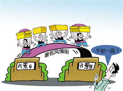 风情街之所以吸引游客,就在于其与众不同的人文风情、地方特色。然而,让游客大为不满的是,走遍全国各地的风情街,却发现大多雷同,千街一面。浓郁的地方风味、独特的工艺传统、活泼的民俗活动大多淹没于一样的街面、大同小异的工艺品商店、毫无特色的小吃店之中。风情街少风情,究其原因,在于过度的逐利性和商业化。为了快速获利,开发商往往采用本土特色较少但利润高,且比较成熟的开发模式,导致当地特色人文风情遭到排挤。因此,对于风情街的开发,当地政府应以长远的眼光,着重保护历史街区的文化特色,因地制宜改善基础设施,让风情街真正有“风情”。这真是: