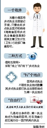 据了解,医师多点执业的程序也得到了简化,无需办理医师多点执业注册登记手续,只需由拟多点执业医疗机构将《海南省医师多点执业备案信息表》报其主管卫生计生(卫生)行政部门备案即可。