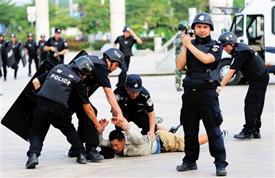8月25日下午,昌江黎族自治县公安局及昌江边防支队100多名警员联合举行恐怖突发事件演练。内容包括解救人质、处置砍人事件等多项科目。