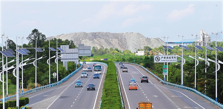 近日,G98环岛高速东线段三亚海棠湾林旺出口附近出现了一座碎石堆积而成的石山,山体裸露,十分显眼,就像阻断了高速公路一样。有市民反映,在国家海岸的高速路旁堆积如此石山有碍观瞻,并质疑,是否会造成粉尘或其他形式的污染?