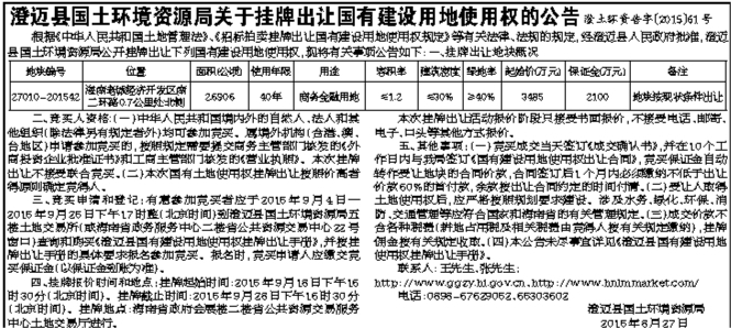 澄迈县国土环境资源局关于挂牌出让国有建设用地使用权的公告