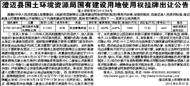 澄迈县国土环境资源局关于挂牌出让国有建设用地使用权的公告