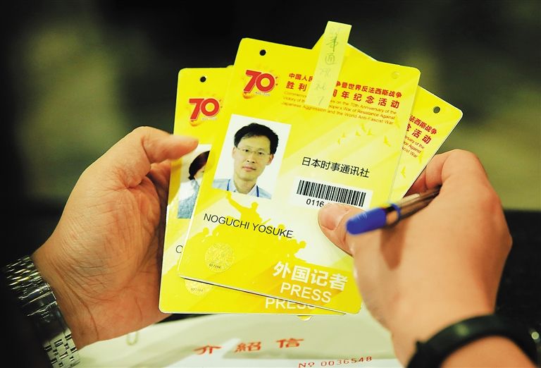 8月26日,在外国记者新闻中心,外国记者领取参加纪念活动记者证件。 当日,参加抗战胜利70周年纪念活动的外国记者在北京开始领取记者证件。