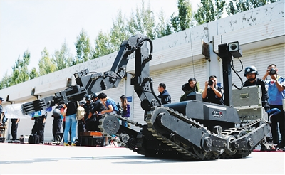 8月27日,银川市公安局巡特警支队展示反恐排爆设备。 当日,宁夏银川市公安局巡特警支队组织开展反恐处突演练,以提高对突发事件的应急反应处置能力。 新华社记者 王鹏 摄