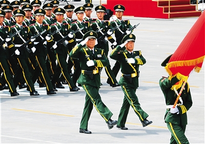 武警部队抗战英模部队方队将军领队徐平少将(中左)和苟春燕少将(中右)同方队士兵一起训练。 在胜利日阅兵10个英模部队方队中,9个方队名称都是由抗战中获得荣誉称号的一支部队命名的,唯有武警部队徒步方队名称被命名为“武警部队抗战英模部队”。作为阅兵场上武警部队唯一一支徒步方队,武警部队抗战英模部队方队代表着武警部队在抗战时期涌现出的全部英模群体,也是新时期时刻奋战在执勤处突最前沿、反恐维稳主战场、抢险救灾第一线的武警部队70万官兵的形象代表。