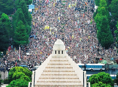 在位于东京永田町的国会大厦外,集会人群举着“反对战争”“不许破坏宪法第九条”“安倍政府下台”等标语,高喊口号,要求国会不得通过安保法案。