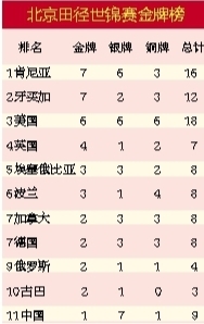 中国田径队在本届世锦赛上最终收获1金7银1铜的成绩,9枚奖牌的成绩超越了1993年斯图加特世锦赛的8枚奖牌,创造单届夺牌最多纪录。肯尼亚和牙买加队均收获7枚金牌,在金牌榜上双双压倒仅夺6金的美国队。不过美国队夺得18枚奖牌,仍是夺牌最多的队伍。(小新)