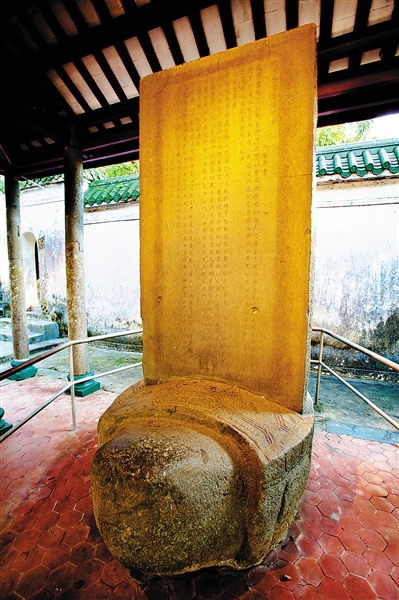 走进五公祠内两伏波祠的访客,往往第一眼就会被拜亭里的一尊巨碑吸引。这就是神霄玉清万寿宫诏碑。神霄玉清万寿宫诏碑通高250厘米、宽130厘米、厚30厘米;碑座为赑屃,神霄玉清万寿宫诏碑由上部碑额和下部正文组成,碑额文字外框内是回纹,底上刻相扣的 “S”形缠枝纹,框左右满雕双龙盘旋而上,气势非凡;碑额与正文之间雕刻云纹,正文左右,下框内是回纹底上刻瘦长的小龙, 正文四角各1条,左右边框龙首朝上各5条,下边框居中龙首相向1对,共16条;碑额为当朝宰相蔡京之子蔡愉奉圣旨题额,竖书2行楷体“御笔手诏”;正文竖书16行,满行40字。文中除了楷体“宣和元年八月十二日,奉圣旨立石”外,均为宋徽宗的“瘦金体”;碑之石质较粗, 正文下部及边框石质风化较重,个别字迹难辨,纹饰不清。从历代名碑和神霄玉清万寿宫诏形制规格分析,神霄玉清万寿宫诏应有碑座, 现仅海南神霄玉清万寿宫诏存赑屃碑座,但经考证,疑非原配物。