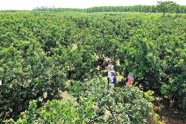 在距离澄迈县金江镇不到30公里远的山口地区,由大学生情侣安烁宇和黄晓玲扎根开辟的200亩无籽蜜柚基地里,沉甸甸的青皮柚挂满了枝头,周边青山绿水环绕,一派田园好风光,是周末假日一家人外出田野活动的好去处。