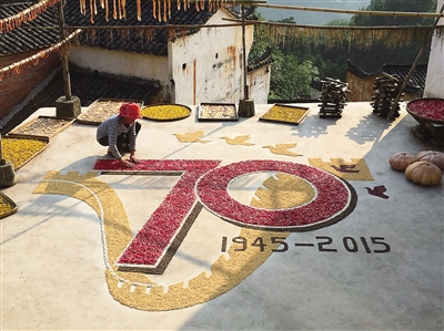 8月30日,江西省婺源县江湾镇篁岭村村民用丰收的玉米、红辣椒、小米等各色农产品,摆出中国人民抗日战争暨世界反法西斯战争胜利70周年纪念活动标识图案。 新华社发(陈先祥 摄)