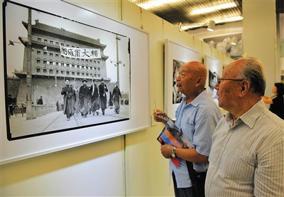 8月31日,观众在中华世纪坛观看展览。 当日,“历史不容忘却——纪念中国人民抗日战争暨世界反法西斯战争胜利70周年”摄影展在北京中华世纪坛开幕。本次展览共展出近300幅作品,涵盖中国战场与世界战场、正面抗战与敌后斗争等不同侧面,还记述了中国人民抚养日本遗孤等感人故事,全方位、多角度地展现了战争给全世界带来的沉痛灾难,展示了中华民族参与世界反法西斯战争的伟大历程。新华社发