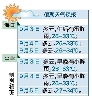 9月1日-2日,受南海低压槽影响,本岛东方、昌江和乐东等市县有大到暴雨、局地大暴雨;其余市县有阵雨或雷阵雨、局地雨量可达暴雨;全岛最高气温28℃-31℃,最低气温23℃-26℃。3日-6日,受偏南气流影响,全岛多云,西北部地区午后有雷阵雨;各地气温上升。