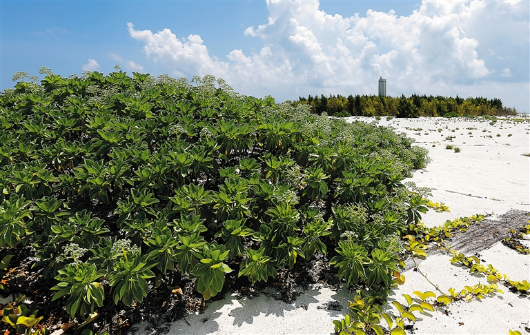 浩瀚无垠的南海泛着碧波轻浪,散落海中的岛屿,好似一颗颗绿宝石闪耀在蔚蓝的底色上。这一抹抹的绿又被一圈圈银白玉带环绕着,银白圈的外层又会有一圈圈若有若无的浅蓝、深蓝、青蓝、藏蓝。层层圈叠,自然过渡的多重色彩彼此交相辉映。大海中灵动的绿色,其实得益于人的雕琢,而这看似天成的人工雕琢,正是三沙市多年来与来自省农科院等科研院校的农业专家不断摸索、研究、引种,无数心血付出所取得的收获。