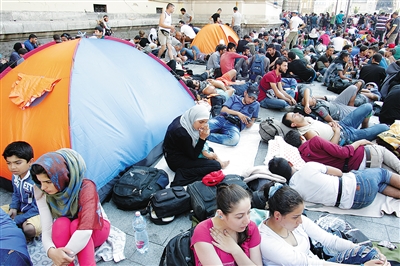 9月1日,在匈牙利首都布达佩斯的东火车站外,难民席地而坐。 当天上午,布达佩斯东火车站因难民问题一度关闭。大量难民聚集在火车站前高呼口号,表示抗议。最近以来,布达佩斯东火车站的难民人满为患,许多人都想从这里搭乘前往德国或奥地利的火车。 新华社发(德莫特尔·乔鲍摄)