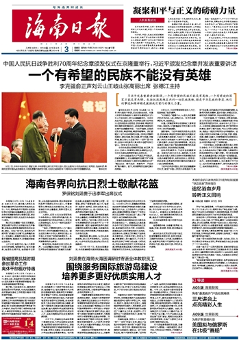 海南日报 头版 001 2015-09-031 2015年09月03日 星期四