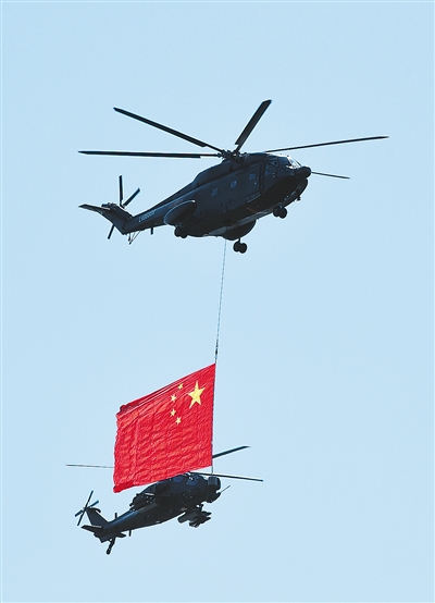 国旗长9米、宽6米,军旗长7.5米、宽6米。这是中国首次悬挂如此巨大的旗帜,以如此高的速度飞行展示。要让国旗、军旗在高速飞行中迎风招展却完好无损,其实并不简单,这曾是阅兵筹备中的一大难题。