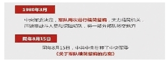 1980年,解放军进行了第六次大裁军。当年3月,中央军委决定,军队再次进行精简整编,大力精简机关,压缩非战斗人员和保障部队,将一部分部队移交地方。全军精简整编工作从1980年第四季度开始实施,至1981年底基本完成,人民解放军总人数由603万人压缩到450万人,初步解决了部队臃肿庞大的问题。