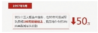 1997年9月,江泽民在党的十五大报告中宣布,在80年代裁减军队员额100万的基础上,我国将在今后3年内再裁减军队员额50万。到1999年底,裁军50万的任务已经完成。这是人民解放军的第九次精简整编。这次裁军的特点是“精兵、合成、高效”,实现解放军由数量规模型向质量效能型、由人力密集型向科技密集型的转变。
