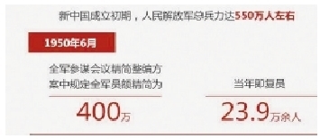 1950年5月,解放军进行了第一次大裁军。当时新中国刚刚成立,人民解放军总兵员550万,“小米加步枪”的步兵是解放军的主体,空军、海军和陆军特种兵几乎是空白。1950年4月,中央政治局决定对军队进行大规模的精简整编复员的重大战略决策。中央军委于5月16日至31日对整编复员工作进行研究、讨论和部署。决定军队复员150万人,将全军的总员额由550万压缩到400万,当年即复员23.9万余人。