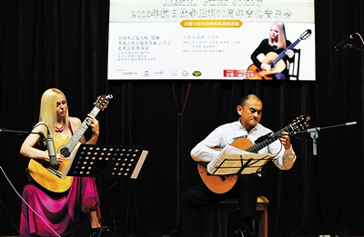 9月3日,由海南省吉他学会主办的“2015纪念抗日战争胜利70周年吉他音乐会”在省图书馆举行。图为来自俄罗斯的美女吉他演奏家安娜·丽嘉芝娃和来自香港的吉他演奏家云天宝在表演二重奏《美隆加舞曲》。本报记者 苏建强 摄