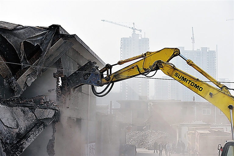 一台大型机械在太原市西寨村进行拆除作业。 今年3月以来,山西省太原市启动加快城中村改造工作,在半年时间内,完成30个村的整村拆除工作,34个村启动回迁安置房建设。据了解,山西将用3年时间,到2017年,开工改造全省330个城中村,涉及22.2万户。新华社记者 詹彦 摄