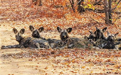 这是2015年9月1日在津巴布韦南部萨维河谷自然保护区内拍摄的一群非洲野狗。 非洲野狗一度有50多万只,但在过去几十年间,由于它们猎食牲畜而遭大规模报复性赶杀,与此同时它们传统的栖息地伴随着人类开荒开发的步伐大量减少,导致非洲野狗数量急剧下降已至濒临灭绝边缘。 新华社记者 许林贵 摄
