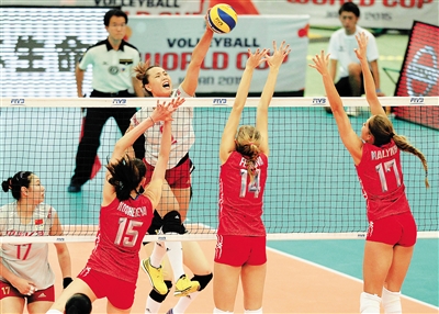 9月5日,在日本名古屋市综合体育馆举行的第12届女排世界杯比赛中,中国女排以3:1战胜俄罗斯女排。
