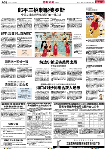 海南日报 体育新闻综合 009 2015-09-061 2015年09月06日 星期日
