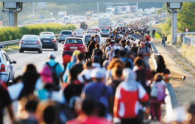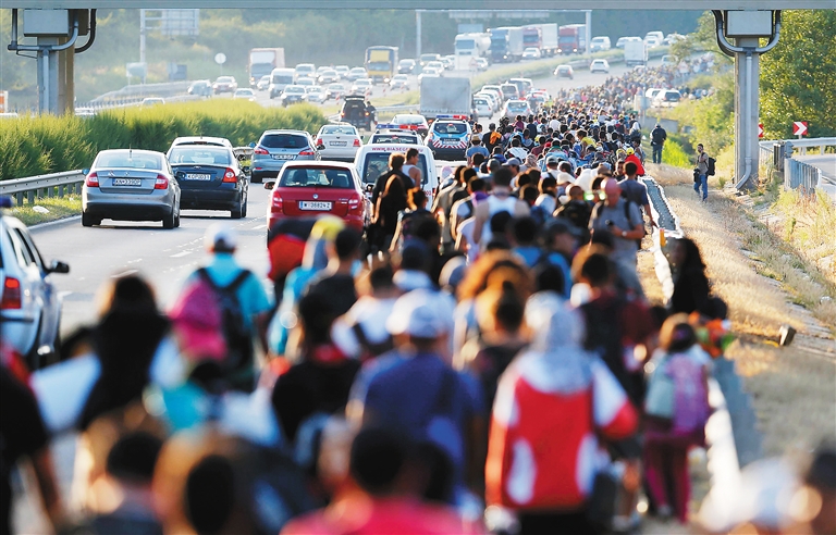? 匈牙利布达佩斯附近,难民沿着高速公路走向奥地利与匈牙利边境。