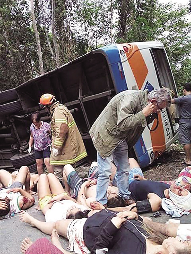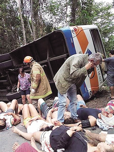 9月6日,在巴西里约热内卢州帕拉蒂市,人们在事故现场救助受伤的乘客。 一辆公交车当天在该州帕拉蒂市附近发生翻车事故,造成至少14人死亡,30多人受伤。