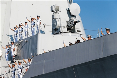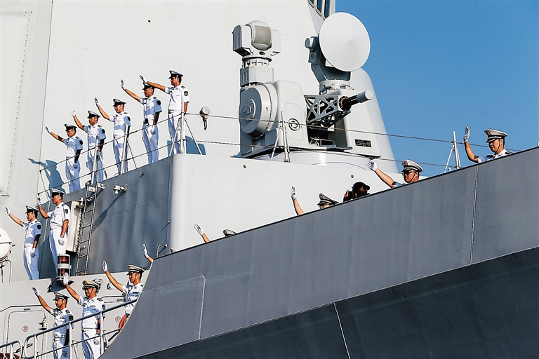 9月6日,在埃及亚历山大港,中国海军152舰艇编队济南舰上的海军官兵在舰弦列队向送行的中埃友好人士致意。 当日,执行环球访问任务的中国海军152舰艇编队结束对埃及的友好访问,离开亚历山大港,前往丹麦哥本哈根。 新华社记者 崔新钰 摄