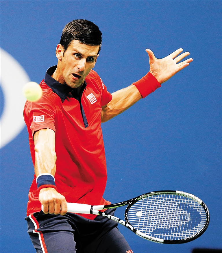 9月6日,在2015年美国网球公开赛男子单打八分之一决赛中,塞尔维亚选手德约科维奇以3:1战胜西班牙选手阿古特,晋级八强。图为德约科维奇在比赛中回球。 新华社发