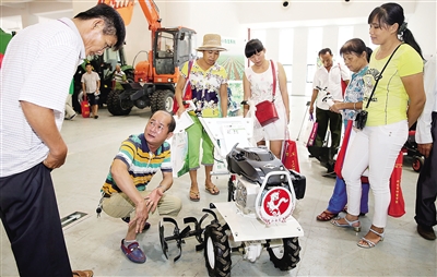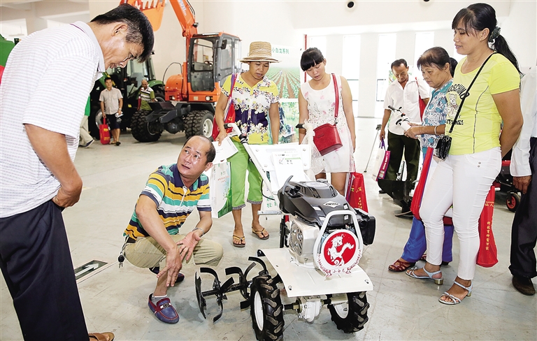 9月7日,为期两天的华南(海南)农资暨种业渔业博览会在海南国际会展中心开幕,开设了新型种苗、新型植保技术、农业电商服务、植物营养服务等6个展区,展出面积达1.5万平方米。现场吸引了近300家企业参展,现场观众流量近5万人次,此次展会全程采用网络直播,农民可足不出户网上看展。图为海口红旗镇农民在博览会上选购微耕机。文/本报记者 张中宝 图/本报记者 苏晓杰