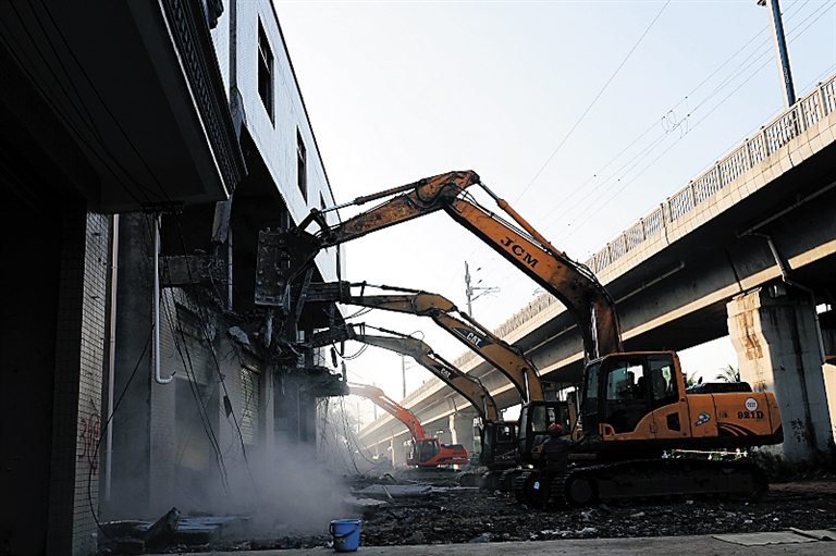 在拆违现场,记者看到,被拆建筑都是当地村民私建的民宅,错落分布在高铁轨道的两侧。琼山城管、消防、公安、凤翔街道办等多个部门近200名工作人员,维持现场秩序,数台重型机械同时作业,“轰鸣”声中扬起厚厚的尘土。