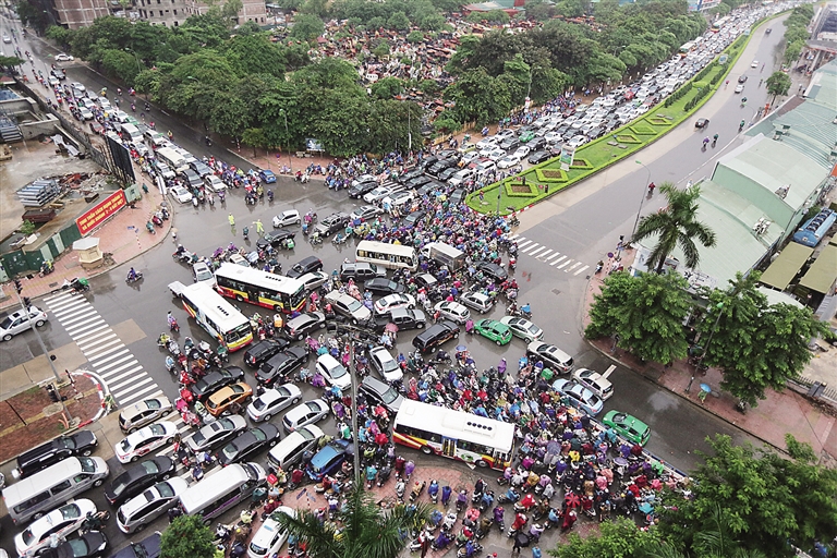 9月8日,越南首都河内突降大雨,部分街道出现大量积水。由于正值上班高峰时段,多条主干道交通严重阻塞。 新华社/越通社