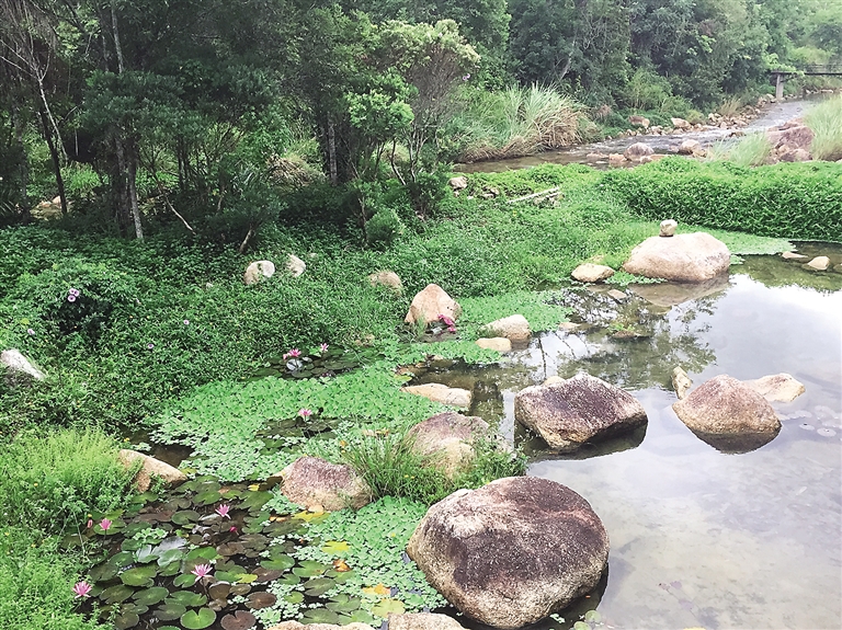 行至尖峰岭雨林谷度假区内,耳畔随即响起阵阵水流声,流淌在怪石群的潺潺溪流,碧蓝澄澈、明丽见底。更为奇妙的是,随着光照的变化,溪水亦呈现不同的色调与水韵。有时,给人感觉玲珑剔透、碧波万倾;风平浪静之时,蓝天、白云、远山、近树倒映湖中,水上水下,虚实难辩,梦里梦外,如幻如真。一湖之中黛绿、淡紫、土黄、翠碧等色彩组成不规则的几何图形,相互浸染,斑驳陆离。