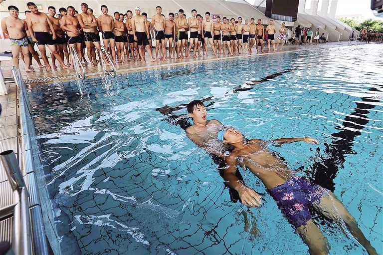 9月7日,2015年海南省体育行业国家职业资格(游泳救生员)培训班在三亚举行。来自三亚约70家酒店和3家物业管理公司的140名救生员将参加为期4天的集中培训。图为救生员在练习水下拖带“溺水者”。本报记者 武威 摄