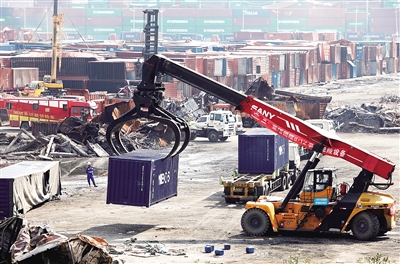 9月8日,大型车辆在清理核心区的集装箱。 9月9日,天津港爆炸事故进入第29天。记者从天津市人民政府新闻办公室获悉,目前核心区集装箱“三号山”,也就是最后一块集装箱堆放区域已清理完毕,现场露出了大量空地。被运出的集装箱多以受损严重的为主,部分较为完好在原地进行保存,等待后续处理。同时,爆炸事故核心区建筑已拆除完毕,清运工作也正同步进行。 新华社发