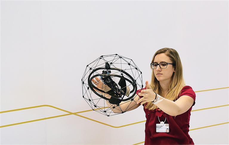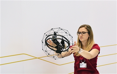 9月9日,瑞士Flyability公司工作人员展示近距离接触无人机。 当日,一款由瑞士Flyability公司生产的耐碰撞无人机(Gimball)在夏季达沃斯论坛上展出,这款无人机外层有一层防撞网,可以耐碰撞并近距离接近人们而不伤害到他们,在重大灾难发生后,它可以帮助救援人员快速找到幸存者。