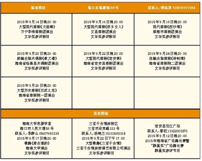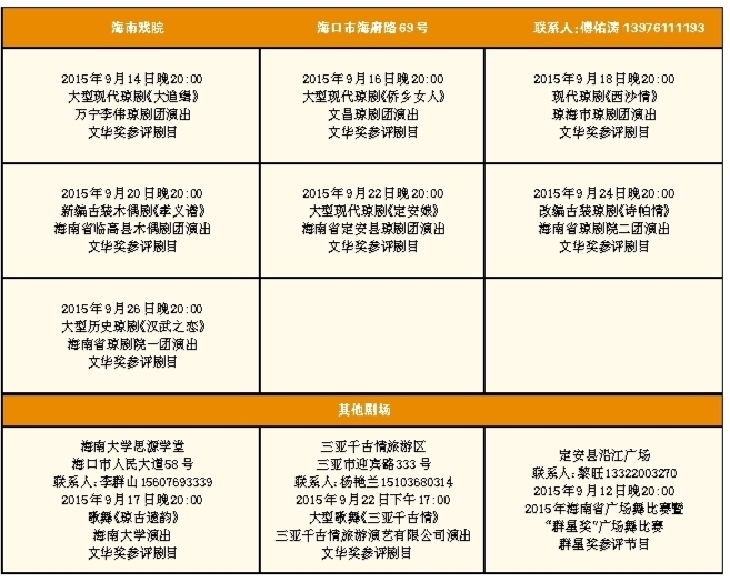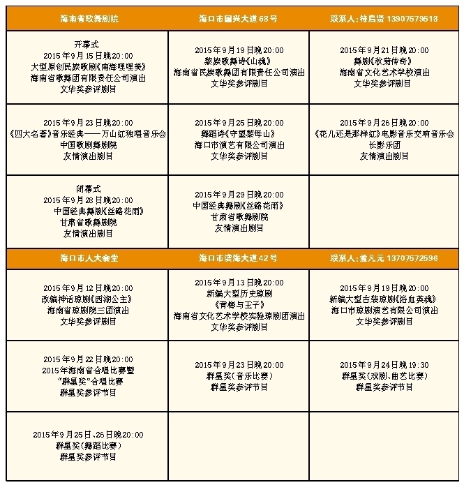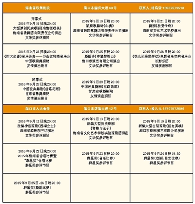 注明:本届艺术节共有25场演出,其中文华奖参评剧目16台,群星奖参评节目5台,友情演出剧目4台。 售票热线:海南省歌舞剧院0898-65301811;海口市人大会堂13707572596孟主任;海南戏院13098901012张小姐;海南大学思源学堂大礼堂18976551009周团长;三亚千古情旅游演艺公司剧场0898-88658333。(海口各场次演出提前三天惠民价售票)