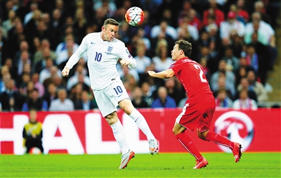 9月8日,在2016年欧洲足球锦标赛预选赛E组的一场比赛中,英格兰队主场以2:0战胜瑞士队。图为英格兰队球员鲁尼(左)在比赛中争顶头球。新华社发