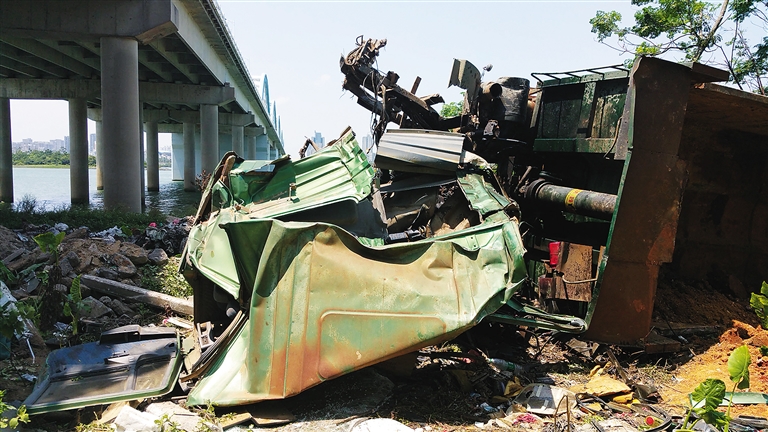 一位网友当时正好驾车跟随货车后面,行车记录仪记录下了整个碰撞过程:货车在机动车道上并未与其他车辆发生碰撞,而是像脱缰野马一样突然冲向路边,最终冲出桥面坠落到10米深桥底,碰撞过程触目惊心。当时在琼州大桥上安装的监控视频也记录下了这一短暂过程,货车从冲入非机动车到坠桥仅仅数秒钟,记者在现场粗略计算,货车撞断的水泥护栏墩约有10米长,可以推测碰撞力度大、事发时车速较快。