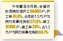 今年以来,各市县积极推进农村危改工作,截至8月底,全省开工36053户,开工率81.9%,占年初1.3万户为民办实事任务的277.3%;竣工12305户,竣工率28%,占1.3万户为民办实事任务的94.7%。