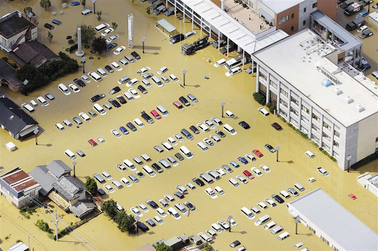 9月11日,在日本茨城县常总市,停车场上的车辆被洪水浸泡。 日本茨城县政府11日说,在10日的洪灾中,有25人下落不明,另有逾千人受困,近6000人被紧急疏散撤离,救援工作仍在进行中。日本关东地区10日普降暴雨,导致当地河流鬼怒川在茨城县常总市段决堤,洪水冲毁部分房屋,全市三分之一面积受淹。 新华社/路透