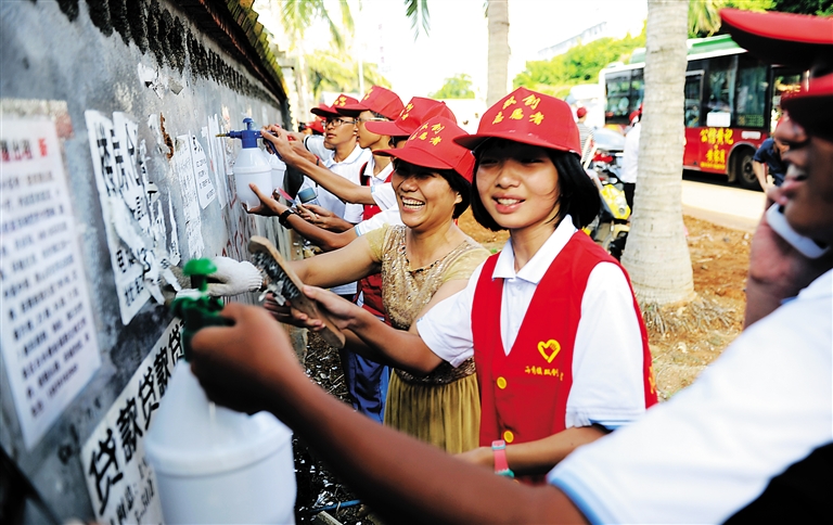 9月11日,海口市秀英区海秀镇,数万名家长与学生一起在附近街道开展大规模清扫活动。