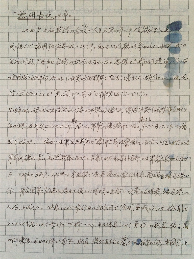 “昭和20年(1945年)5月,我们一行100人乘坐木造船从秀英港到达雷州半岛的南端海安,一路上经常遭到联盟军飞机的轰炸和袭击,我们夜里11点上船出海直到第二天早晨6点才到达海安上岸。步行了4、5个小时到达徐闻县城,街上空无一人,我们在徐闻休息了两三天又步行到下桥休息半天再到达青桐,在此地训练两周,然后每日步行直到到达湛江,又经廉江向广西进发。一路上时不时与中国陆军遭遇战斗,中队死伤十多人,敢死队也遭遇中国军队的迫击炮被打散了,我们的武器严重弹药不足,缺水缺药没粮食补充,最后连收发电报用于记录的纸张、笔甚至发报机的电池都全部没有了。夜里我们会去老百姓的田里偷挖芋头地瓜这些东西来吃,负伤人员众多。夜里我们只能睡在潮湿的海边草地上,听着伤兵的呻吟,还有人在暗自哭泣,那种情景犹如日本古歌里的哀调。长夜漫漫如此惨淡,士兵们厌恶了战争渴望回到家乡,长夜漫漫无明日……”